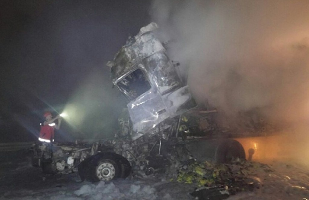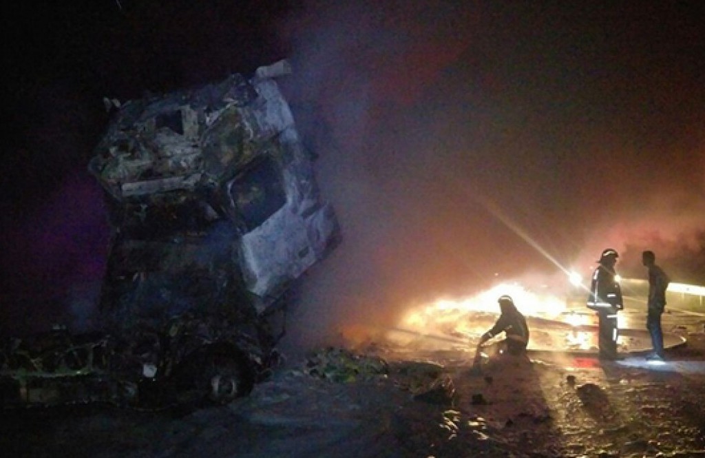 Akyazı ilçesi TEM otoyolunda İstanbul’dan Ankara İstikametine gitmekte olan 18 BC 839 plakalı sunta yüklü kamyonun ön lastiği patladı. Durumu fark eden kamyon sürücü kamyonu emniyet şeridine çektiği sırada aynı istikamete giden ve plakası öğrenilemeyen tır kamyona arkadan çarptı. Çarpışmanın etkisiyle tırın ön kupası arkaya kadar ezildi. Ezilen kupada çarpışma sonrası yangın çıktı. Çıkan yangın hızla büyüyerek bütün tırı sardı. Durumu gören diğer sürücüler hemen itfaiye ve sağlık ekiplerine haber verdi. Olay yerine çok sayıda itfaiye ve sağlık ekibi sevk edildi. İl merkezi ve ilçelerden çok sayıda olay yerine gelen Sakarya Büyükşehir Belediyesine bağlı itfaiye ekipleri çıkan yangına kısa sürede müdahale etti. Tır yangını söndürülmesinin ardından tırın içinde sıkışan iki kişi yanarak can verdiği ortaya çıktı.