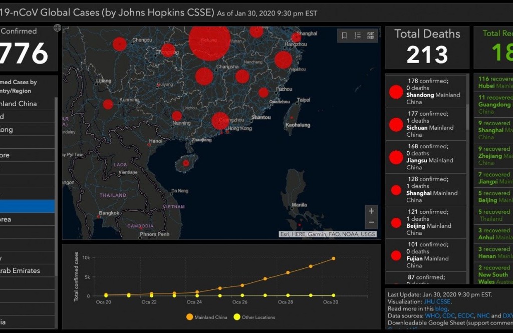Johns Hopkins Üniversitesi tarafından sağlanan bilgiler arasında bugüne kadar doğrulanan toplam vaka sayısı, hangi ülkede kaç hasta olduğu, Corona virüsünden ölenlerin sayısı ve virüsten tamamen kurtulanlar gibi bilgiler mevcut. Paylaşılan bilgilere göre şu an doğrulanan 9 bin 776 vaka bulunuyor. Corona virüsü nedeniyle hayatını kaybedenlerin sayısı 213, virüsten tamamen kurtulanların sayısı ise 187. Johns Hopkins Üniversitesi tarafından paylaşılan haritaya buradan ulaşabilirsiniz.