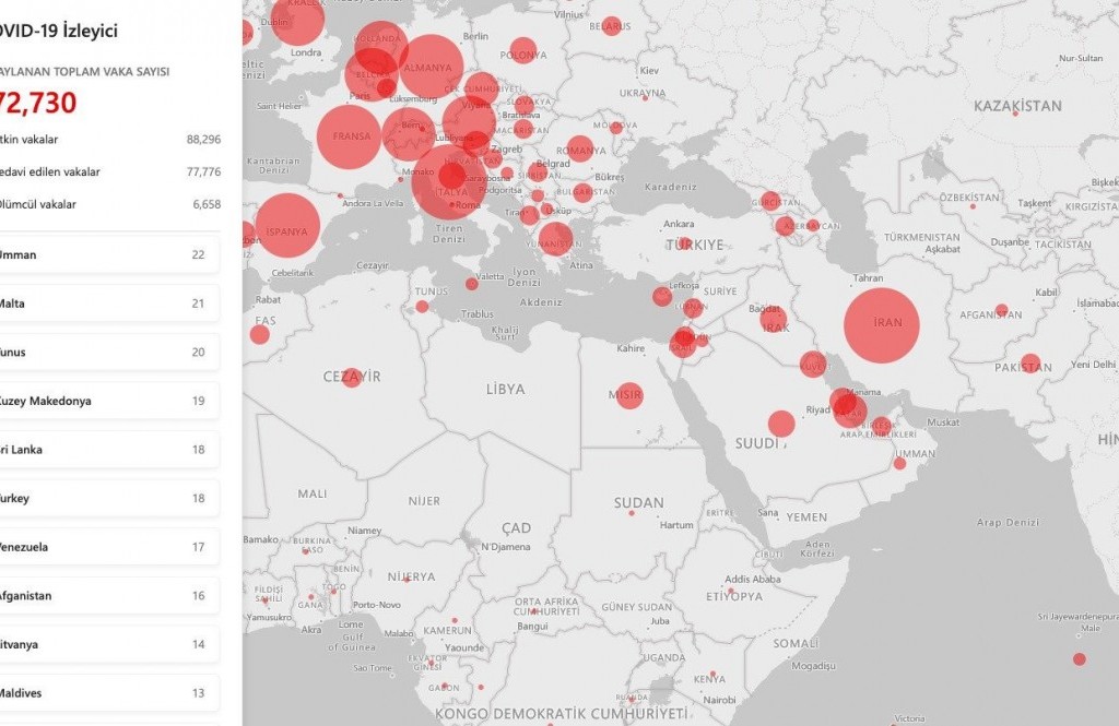 Johns Hopkins Üniversitesi'nin haritasına oranla daha hızlı çalışan, mobil cihazlar için daha iyi bir deneyim sunan ve tamamen Türkçe olan COVID-19 İzleyici haritasına dilerseniz buradan ulaşabilirsiniz.